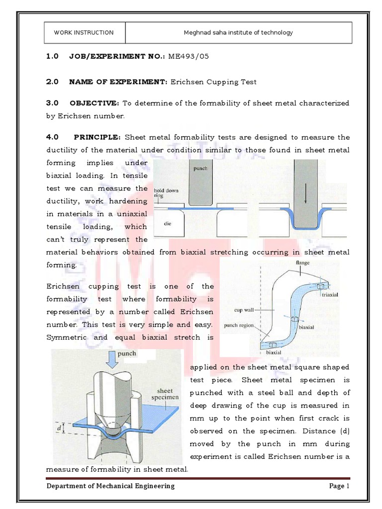 Erichsen cupping test for sheet metal includes placing the metal sheet in the machine and punching a cup into the sheet until a crack appears.